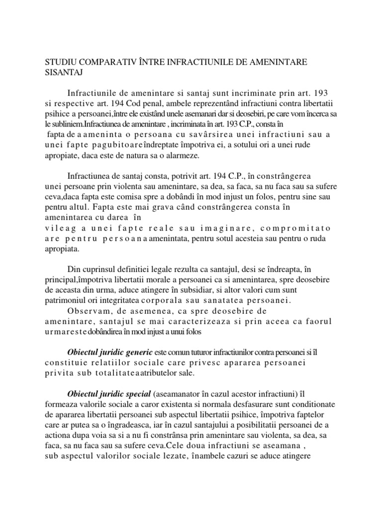 Studiu Comparativ Intre Infractiunile De Amenintare Sisantaj