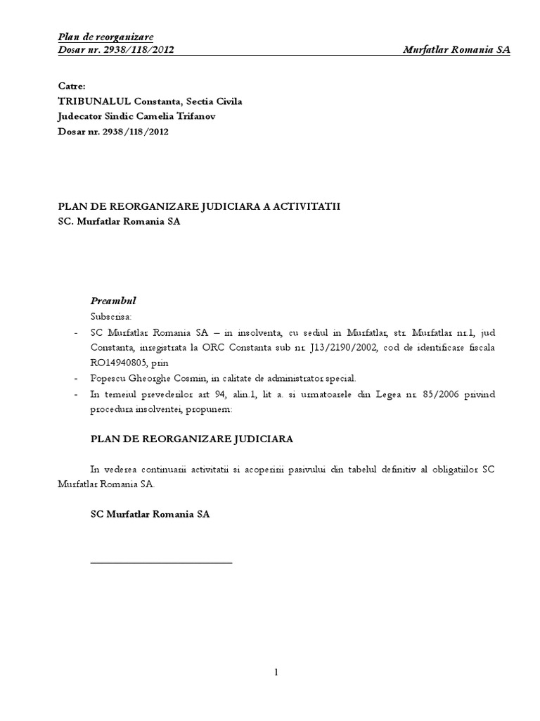 Plan De Reorganizare Sc Romtextil Sa Expert Cont Insolvency Ipurl